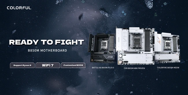 Công ty Công nghệ COLORFUL ngày 28-11-2025 đã công bố ba sản phẩm mới bổ sung cho dòng bo mạch chủ B850 gồm: CVN B850M ARK FROZEN, BATTLE-AX B850M-PLUS S WIFI7, và COLORFIRE B850M-MEOW WIFI7. Các mẫu bo mạch chủ mới này mang đến khả năng cung cấp điện năng được cải tiến, nâng cấp kết nối và thiết kế đặc trưng của COLORFUL, đáp ứng nhu cầu về hiệu