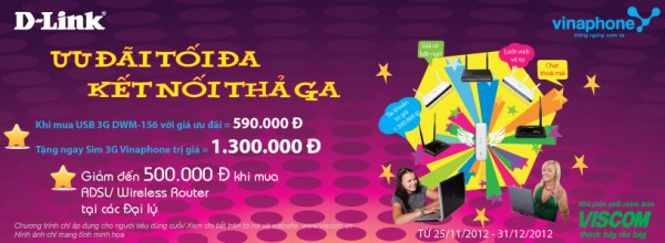 (STS:05.12.2012) Viscom – nhà phân phối chính thức các thiết bị mạng thương hiệu D-Link – đang tổ chức chương trình khuyến mãi “Ưu đãi tối đa – kết nối thả ga” dành cho các Khách hàng khi mua Wireless Router/ADSL và USB 3G tại các đại lý của Viscom với các ưu đãi lớn như giảm giá và tặng quà khi mua hàng.