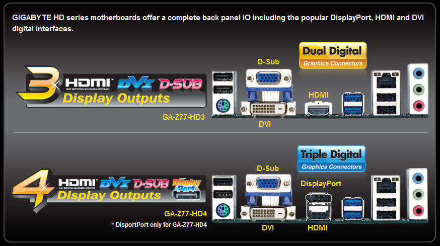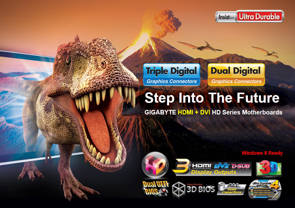 (STS:17.12.2012) Hãng Gigabyte đã đưa ra dòng motherboard HD mới cung cấp 2 cổng digital display, gồm HDMI và DVI, cho phân khúc thị trường đại trà. Giờ đây, những người mê máy tính DIY có thể tận hưởng khả năng HD display thật sự thông qua các công nghệ digital outpot tích hợp phổ cập nhất trên các màn hình và TV chuẩn HD.