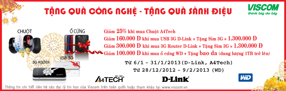 Viscom – nhà phân phối chính thức các sản phẩm mang thương hiệu D-Link, A4Tech, WD tại Việt Nam đang tổ chức chương trình khuyến mãi “Tặng quà công nghệ – Tặng quà sành điệu” dành cho các khách hàng khi mua Router 3G, USB 3G, chuột, ổ đĩa cứng tại các đại lý của Viscom với các ưu đãi lớn như giảm giá và tặng quà khi mua hàng.