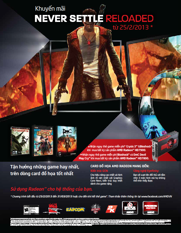 (STS:25.02.2013) Từ 25-2 đến 31-3-2013, khi mua bất kỳ card đồ họa nào thuộc dòng AMD Radeon HD 7900 và HD 7800, khách hàng sẽ được nhận ngay thẻ game có bản quyền đang “hot” trên thế giới. Cụ thể, khi mua card AMD Radeon HD 7900 series, khách hàng sẽ được game bản quyền “BioShock Infinite” và “Crysis 3”; và khi mua card AMD Radeon HD 7800 series sẽ nhận game “BioShock Infinite” và “DmC Devil May Cry”.