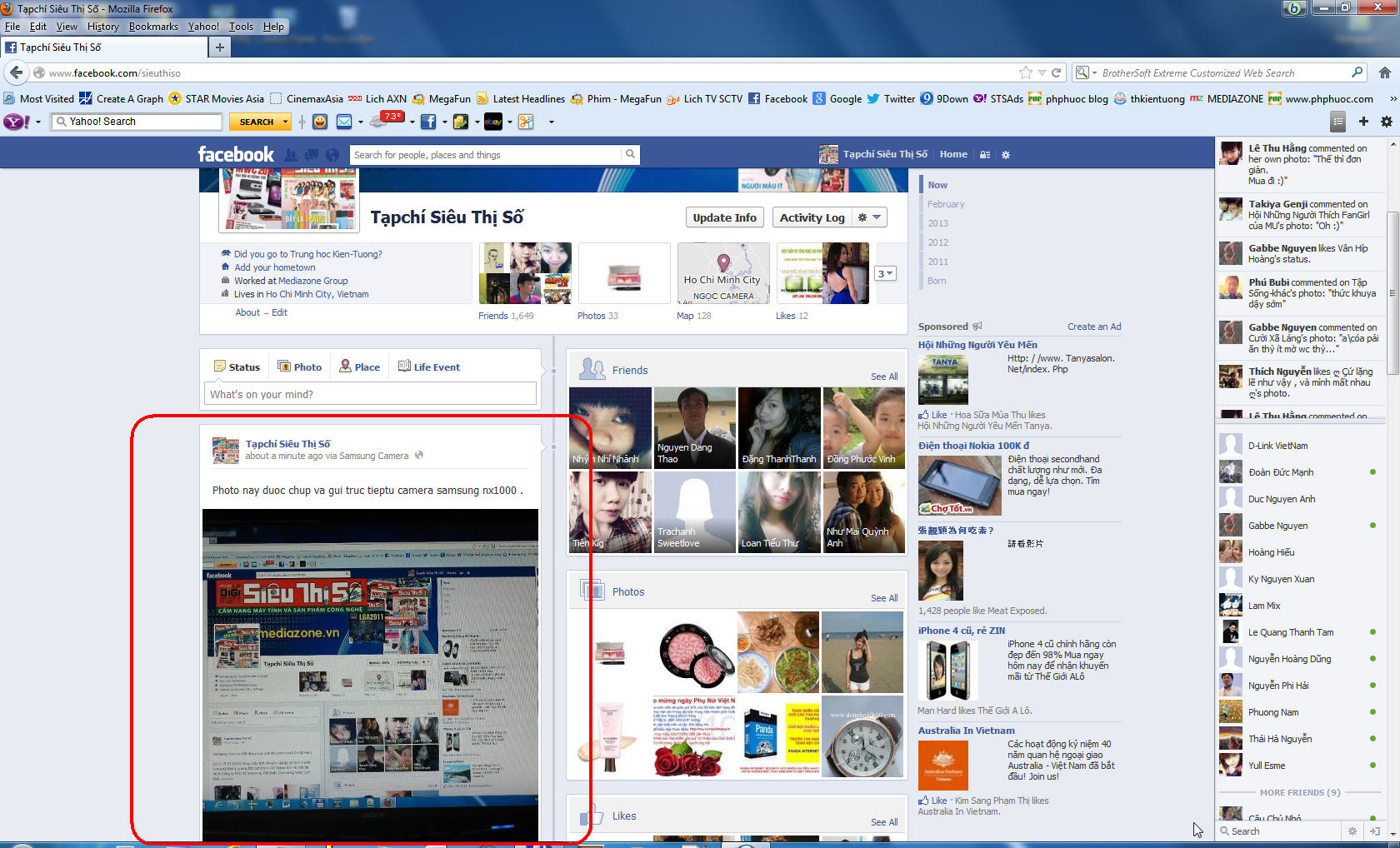 Camera sẽ dò tìm nguồn phát Wi-Fi (hotspot, access point, Wi-Fi router,…) ở nơi nó đang có mặt. Nếu đó là nguồn Wi-Fi mới, bạn sẽ phải thiết đặt các thông số để kết nối. Nếu trước đó bạn đã thiết đặt kết nối với account FB của mình, nó sẽ tự động sử dụng account này. Sau khi kết nối thành công, trên màn hình camera là gallery ảnh và video mà bạn đã ghi được. Bạn có thể chọn 1 hay nhiều file để up. Phần comment cho phép bạn nhập tối đa 65 ký tự. Nhập bằng bàn phím OSD trên màn hình không cảm ứng nên phải dùng wheel di chuyển và nhấn chọn từng ký tự khá là vất vả. Camera sẽ tự động convert ảnh gốc thành ảnh nhỏ để tiện post. Tôi chụp ảnh 20M (kích thước 5470×3648 pixels, dung lượng 5,4MB) và camera thu nhỏ lại còn 1200×800 pixels, dung lượng 247KB để upload (tất nhiên file gốc vẫn y nguyên trên camera).