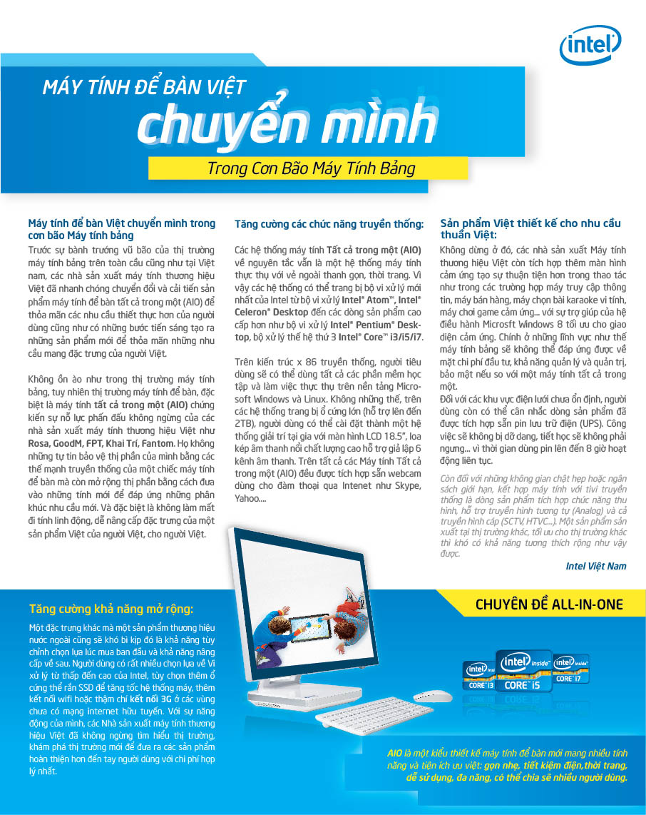Không ồn ào như trong thị trường máy tính bảng, tuy nhiên, thị trường máy tính đề bàn, đặc biệt là máy tính AIO chứng kiến sự nỗ lực phấn đấu không ngừng của các nhà sản xuất máy tính thương hiệu Việt như Rosa, GoodM, FPT, Khai Trí, Fantom. Họ không những tự tin bảo vệ thị phần của mình bằng các thế mạnh truyền thống của một chiếc máy tính để bàn mà còn mở rộng thị phần bằng cách đưa vào những tính năng mới để đáp ứng những phân khúc nhu cầu mới. Và đặc biệt là không làm mất đi tính linh động, dễ nâng cấp đặc trưng của một sản phẩm Việt, của người Việt, cho người Việt.