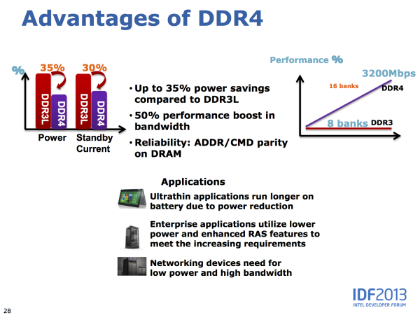 Nền tảng vi kiến trúc Intel Haswell có bộ điều khiển bộ nhớ được unlocked, có tùy chọn step 200MHz và 266MHz, hỗ trợ tỷ lệ bộ nhớ (memory ratio) tới 2933MHz. Các hệ thống Intel tương lai sẽ hỗ trợ thế hệ bộ nhớ mới DDR4. So với DDR3L, DDR4 có băng thông tăng 50% và tiết kiệm 35% năng lượng. DDR4 có xung nhịp tốc độ và tốc độ truyền dữ liệu nhanh hơn (2133-4266 MT/s so với 800 MT/s của DDR3), có điện áp thấp hơn (1,05-1,2 volt so với 1,2 – 1,65 volt của DDR3). DDR4 có Internal bank tăng gấp đôi so với DDR3 (16 bank so với 8 bank). Thanh DDR4 có 284 chân (so với 240 chân của DDR2/DDR3). Các chân sẽ khít nhau hơn (0,85mm thay vì 1mm) để vừa với chiều dài chuẩn của DIMM 133,35mm. Thanh DDR4 sẽ cao hơn một chút so với DDR3 (31,24mm so với 30,35mm) giúp tín hiệu di chuyển dễ dàng hơn và có bề dày 1,2mm (so với 1mm của DDR3) vì có nhiều lớp tín hiệu hơn. Dạng DDR4 SO-DIMM có 256 chân (so với 204 chân của DDR3). Các chân cũng khít hơn. Thanh DDR3 SO-DIMM có chiều cao tương tự ở DDR3, nhưng dài hơn một chút (68,6mm so với 67,6mm).