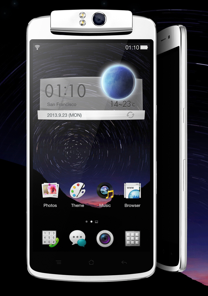 Nhân vật chính của đêm này Oppo N1 là một smartphone khá lạ. Thiết kế được chau chuốt từ kiểu dáng tới chất liệu, mỏng và đẹp theo phong cách thiết kế Lined body design với những đường chỉ viền được chăm chút. Cấu hình mạnh. Máy được trang bị CPU Qualcomm Snapdragon 600 quad-core 1,7GHz và GPU Qualcomm Adreno 320. Màn hình 5,9 inch IPS Full HD (1920×1080), 377ppi được gia cố bằng kính cường lực Gorilla Glass 3 vừa bền, vừa giúp tăng thêm mức độ cảm ứng. Máy có bộ nhớ RAM 2GB và bộ nhớ lưu trữ ở 2 mức 16GB và 32GB. Hệ điều hành mới Color OS của Oppo dựa trên nền tảng Android 4.2. Mạng GMS và WCDMA (xài Micro SIM); Bluetooth 4.0; Wi-Fi 802.11 a/b/g/n/ac, dual-band, Wi-Fi Direct, DLNA, Wi-Fi hotspot. Cổng micro USB 2.0 hỗ trợ cáp USB OTG để kết nối với ổ lưu trữ USB, đầu đọc thẻ nhớ, keyboard, chuột,… Pin tới 3.610mAh với tính năng sạc đầy trong 2-3 giờ. Kích thước máy 170,7 x 82,6 x 9 mm; trọng lượng 213g.