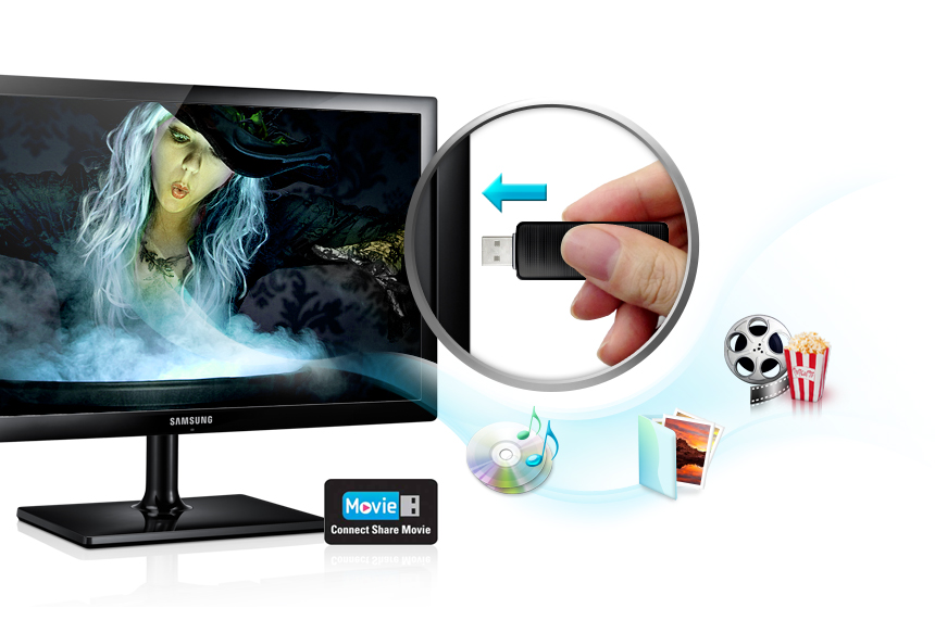 Samsung TV Monitor T24C350 có hệ thống cổng kết nối đa dạng. Cổng D-Sub VGA cho phép người dùng kết nối chiếc màn hình với máy tính để hoạt động như một bộ máy tính để bàn. Cổng HDMI kết nối hình ảnh với các thiết bị điện tử như máy chơi game, máy tính xách tay, trực tiếp truyền tải hình ảnh từ các thiết bị chụp ảnh hoặc kết nối với chiếc điện thoại thông minh qua tính năng MHL. Đặc biệt với tính năng ConnectShare, T24C350 cho phép người dùng trình chiếu trực tiếp các nội dung đa dạng như hình ảnh, phim, clip ca nhạc từ USB Flash drive hay ổ cứng USB bằng cách cắm trực tiếp vào màn hình mà không cần thiết bị trung gian như máy tính.