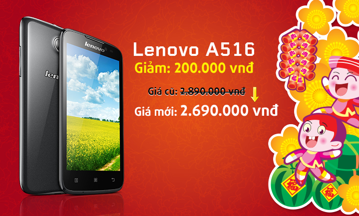 Lenovo A516 (giá tham khảo: 2.890.000 đồng, giá mới: 2.690.000 đồng, mức giảm: 200.000 đồng)