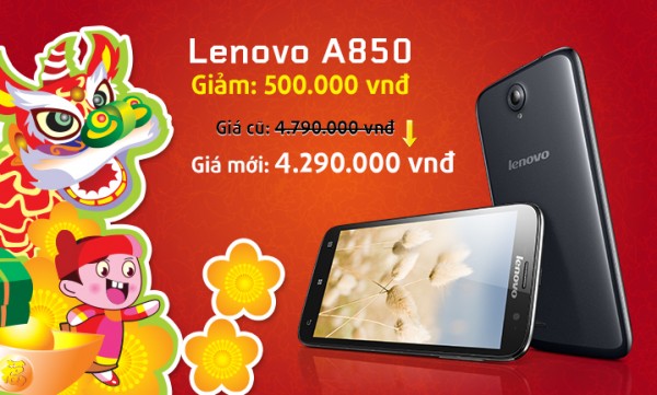 Lenovo A850 là chiếc smartphone Android tầm trung có màn hình lớn nhất hiện nay của Lenovo với thiết kế đẹp mắt có các góc được bo tròn, viền máy mạ crom sang trọng. Model này chính thức có mặt trên thị trường Việt Nam từ tháng 10-2013 với giá 4.790.000 đồng và bây giờ được FPT áp dụng mức giá mới giảm đến 500.000 đồng, chỉ còn 4.290.000 đồng. Với chính sách ưu đãi đặc biệt này, anh Hoàng Hữu Huỳnh – Giám đốc Công ty TNHH TM & XD Hoàng Hà cho biết: “Với mức giá mới này, chắc chắn sẽ lại xuất hiện tình trạng “cháy hàng” Lenovo A850 trên kênh của chúng tôi, bởi sản phẩm này là một trong những sản phẩm bán chạy nhất trong hệ thống cửa hàng Hoàng Hà của chúng tôi ở Hà Nội và TP.HCM hiện nay”.