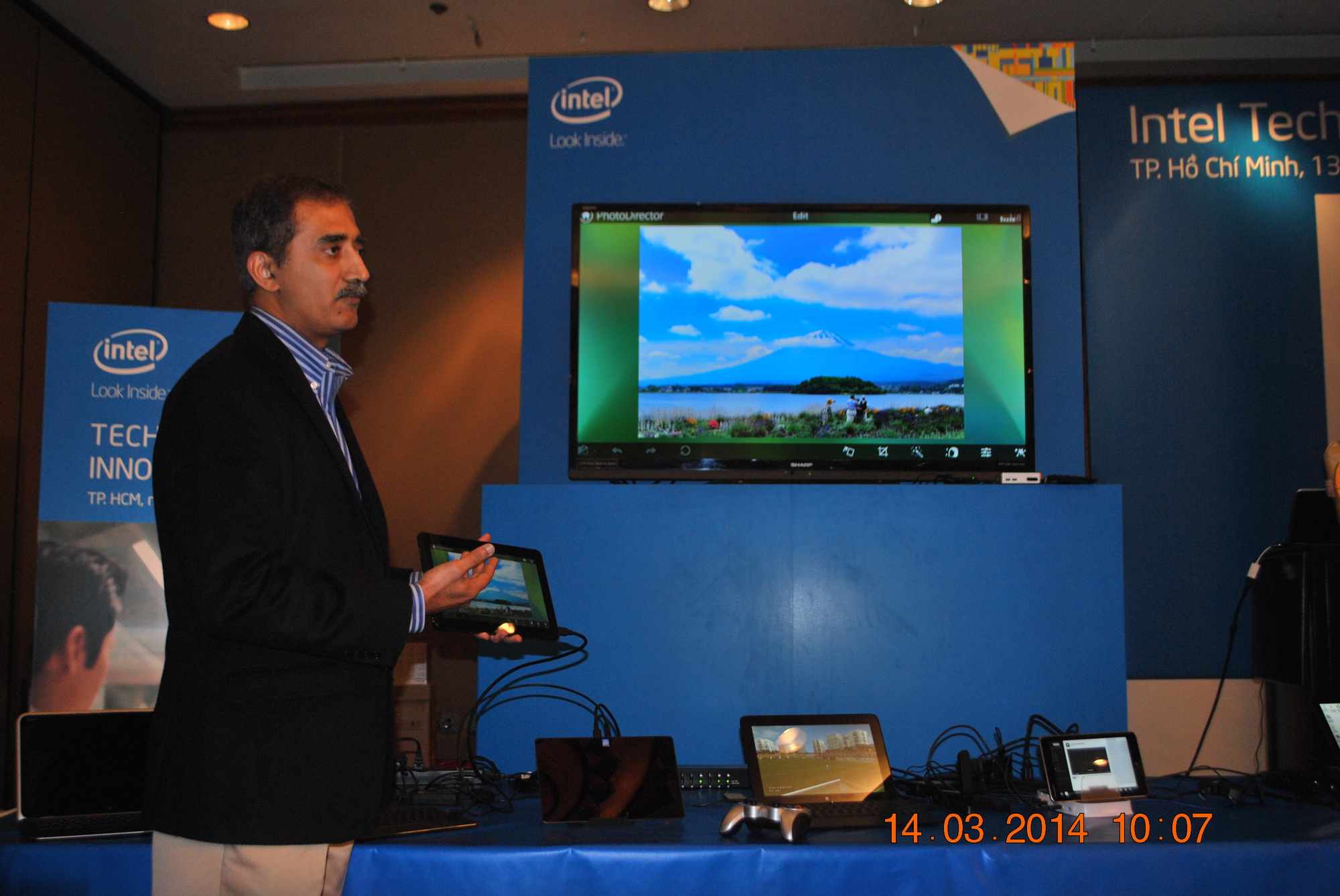 Đến với ngày Intel Tech Days 2014 tại TP.HCM (14-3-2014), tôi đã bị mộng mị, tơ tưởng này nọ với quá chừng là những thiết bị điện toán di động mới chạy các chip xử lý Intel thế hệ mới nhất. Toàn là hàng họ của những “ông lớn” như HP, Sony, Dell, Asus,… Và ngoại trừ những tablet 7 inch, 8 inch ra, hàng 10 inch trở lên toàn là dòng 2-in-1 lai giữa laptop và tablet. Chúng có hai dạng: hoặc là màn hình xoay theo trục ngang (convertible) để nằm lên mặt trên hay mặt dưới bàn phím, hoặc là màn hình và bàn phím có thể tách rời nhau (detachable).