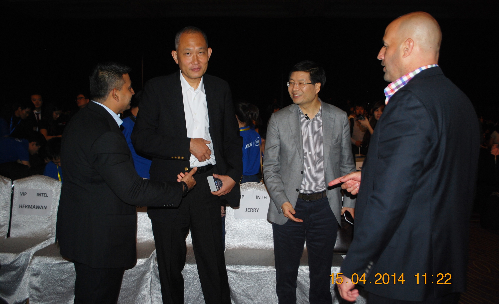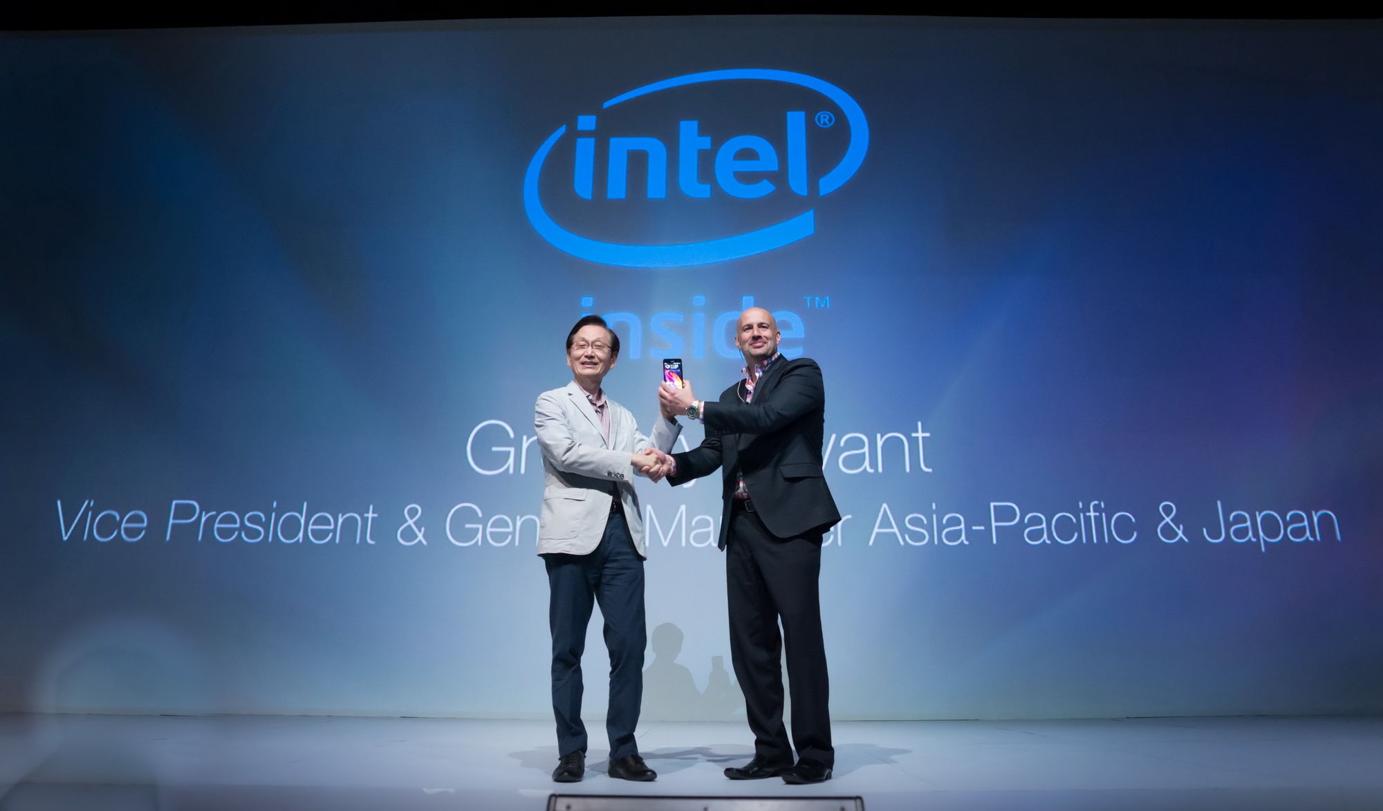 Chủ tịch tập đoàn ASUS Jonney Shih (trái) và Phó Chủ tịch kiêm Giám đốc Điều hành Intel khu vực Châu Á – Thái Bình Dương & Nhật Bản, Gregory Bryant tại buổi ra ma71t Zenfone ở Jakarta ngày 15-4-2014.