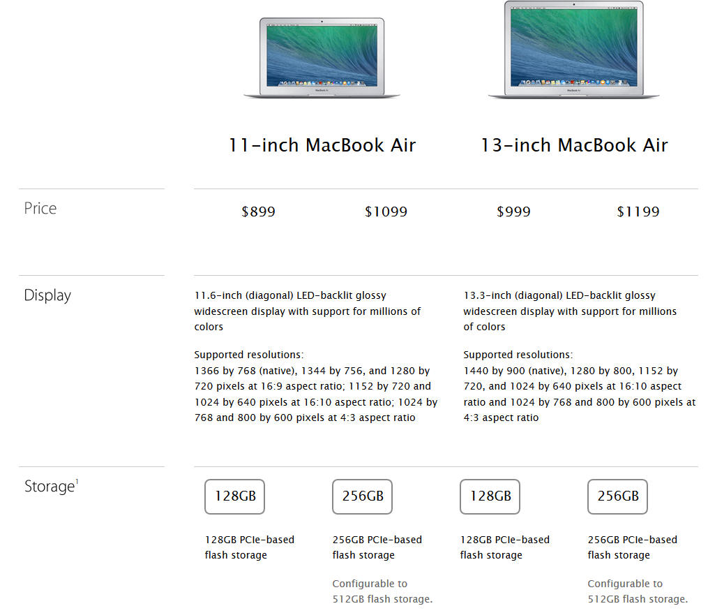 Tuy nhiên, điều đáng giá chính là Apple đã giảm giá 100 USD cho mỗi chiếc MacBook Air đời 2014. Phiên bản rẻ nhất có màn hình 11 inch và ổ lưu trữ 128GB còn 899 USD; trong khi phiên bản đắt nhất có màn hình 13 inch và ổ lưu trữ 256GB giá 1.199 USD. Phiên bản 11 inch ổ lưu trữ 256GB giá 1.099 USD và phiên bản 13 inch ổ lưu trữ 128GB giá 999 USD.