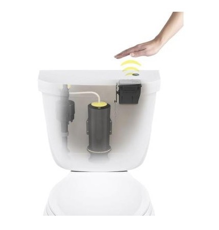 Bộ kit chạy bằng 4 cục pin AA này được gắn vào bên trong thùng chứa nước của bồn vệ sinh. Nó có một cảm biến mà khi bạn đưa bàn tay lướt qua là sẽ kích hoạt hệ thống xả nước.