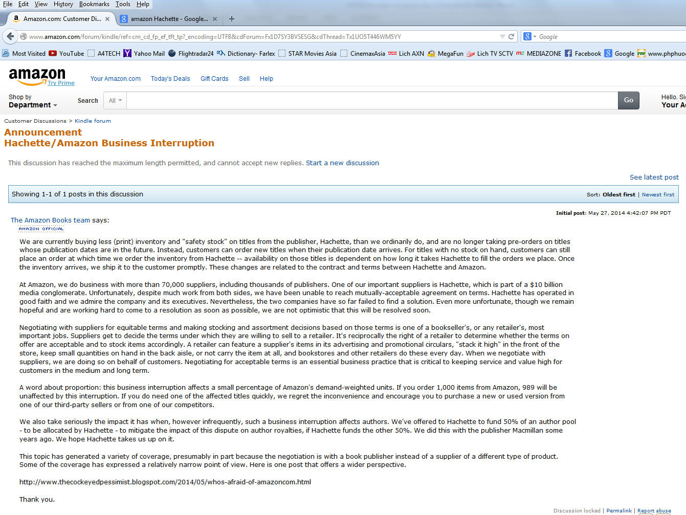 (STS:30.05.2014) Lâu nay thiên hạ mới nghe đồn ngoài hành lang về vụ đấu nhau giữa ông lớn bán lẻ trực tuyến Amazon và ông lớn xuất bản sách Hachette, bây giờ Amazon khẳng định đó là sự thật. Công ty bán hàng qua mạng này đang giơ cơ bắp ra hòng ép một trong những đối tác sách lớn nhất của mình phải chiều theo ý họ.