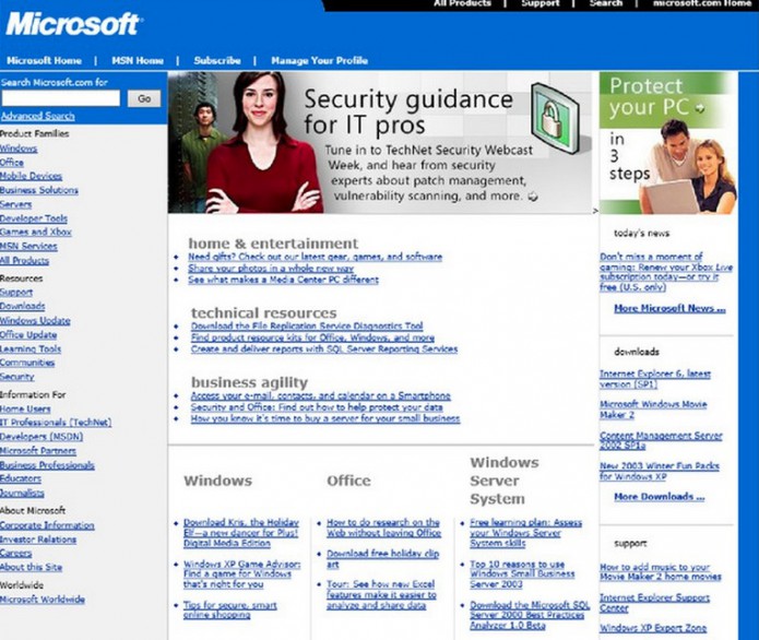 Vào năm 1994, khi thiên hạ đang chạy Windows 3.1, trang chủ của Microsoft chạy trên nền tảng Windows NT Server 3.5. Hồi đó, khi đưa lên trang web một giao diện “điệu đàng” (so với lúc đó thôi) với các menu nằm trên nền hình ảnh màu sắc thô sơ, Microsoft đã phải cẩn thận chú thích rằng nếu như trình duyệt web của bạn không hỗ trợ hình ảnh đó, bạn có thể click vào cái link để mở menu dạng text. Vào thời điểm 1994, trang chủ của Microsoft là một trong số 1.000 trang Web đầu tiên có trên Internet (bây giờ thế giới Internet có tới gần 1 tỷ trang web).