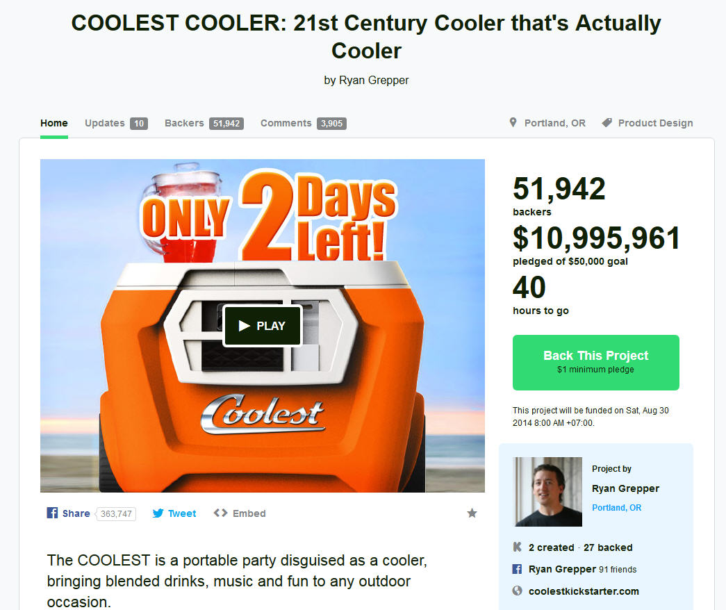 (STS:29.08.2014) Chúng tôi từng giới thiệu với các bạn chiếc thùng ướp lạnh đa năng mang tính công nghệ Coolest. Bây giờ, nó trở thành dự án mời vốn tập thể thành công nhất xưa nay trên trang khởi nghiệp Kickstarter. Tính tới 15g30 chiều 28-8-2014, nghĩa là còn 2 ngày nữa là hết thời hạn gọi vốn, dự án này đã có được 51.943 người cam kết góp vốn với tổng số tiền lên tới 10.995.961 USD, đạt tới 22.021% so với nhu cầu vốn ban đầu.