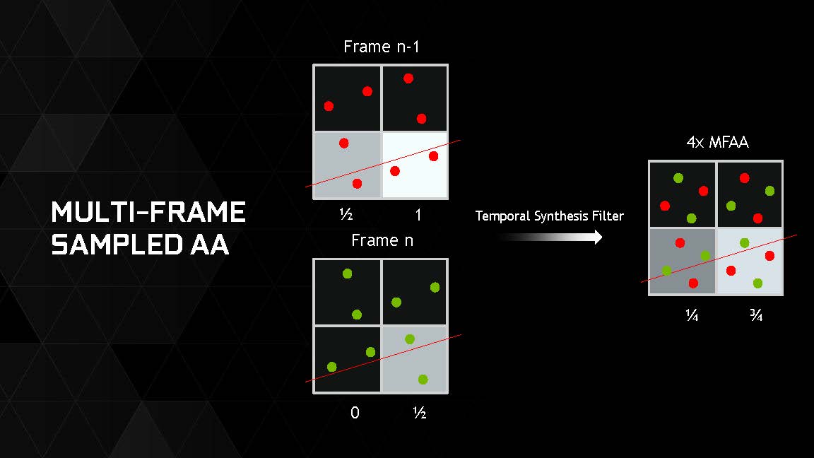 Cũng với GPU Maxwell, NVIDIA đã giới thiệu một công nghệ khử răng cưa mới gọi là Multi-Frame Sampled Anti-Aliasing (MFAA) với phương pháp lấy mẫu nhiều khung hình. Điều độc đáo của công nghệ chỉ có ở GPU Maxwell này là cải thiện chất lượng hình ảnh tối đa với sức mạnh tối thiểu (có nghĩa là GPU không cần phải gồng mình, ráng sức vừa giảm tuổi thọ, vừa tốn thêm năng lượng).