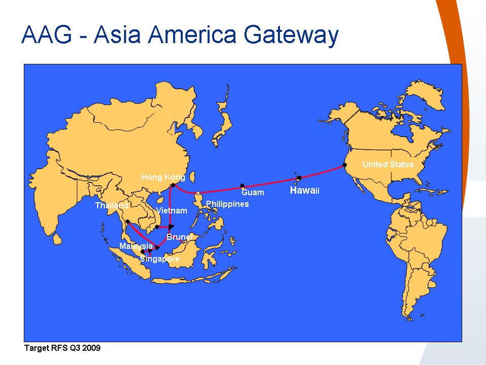 Không chỉ có Việt Nam. AAG là đường trục Internet nối từ Singapore, Malaysia, Thái Lan, Brunei, Việt Nam (điểm cập bờ ở Vũng Tàu) tới Hong Kong, rồi từ đó đi tiếp sang Philippines, đảo Guam, và Hawaii cuối cùng cập bờ duyên hải miền tây nước Mỹ. Toàn bộ đường cáp đi ngầm dưới đáy Thái Bình Dương.