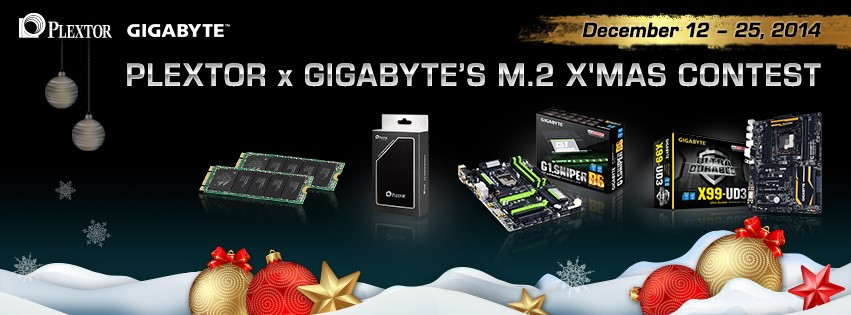 (STS:15.12.2014) Hãng sản xuất ổ cứng thể rắn SSD Plextor và hãng sản xuất bo mạch chủ Gigabyte kết hợp tố chức cuộc thi M.2 mừng Giáng sinh 2014. Mọi người quan tâm có thể tham gia trả lời các câu hỏi từ ngày 12-12đến ngày 25-12-2014 để có cơ hội giành giải thưởng gồm những ổ cứng SSD PCIe M.2 tốc độ cao cũng như bo mạch chủ mới nhất của Gigabyte giúp cải thiện hiệu năng hệ thống máy tính tại gia của mình chuẩn bị cho năm mới 2015.