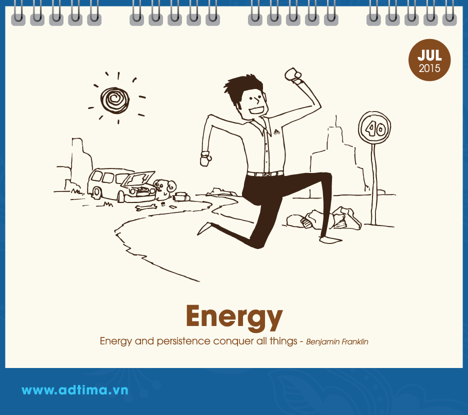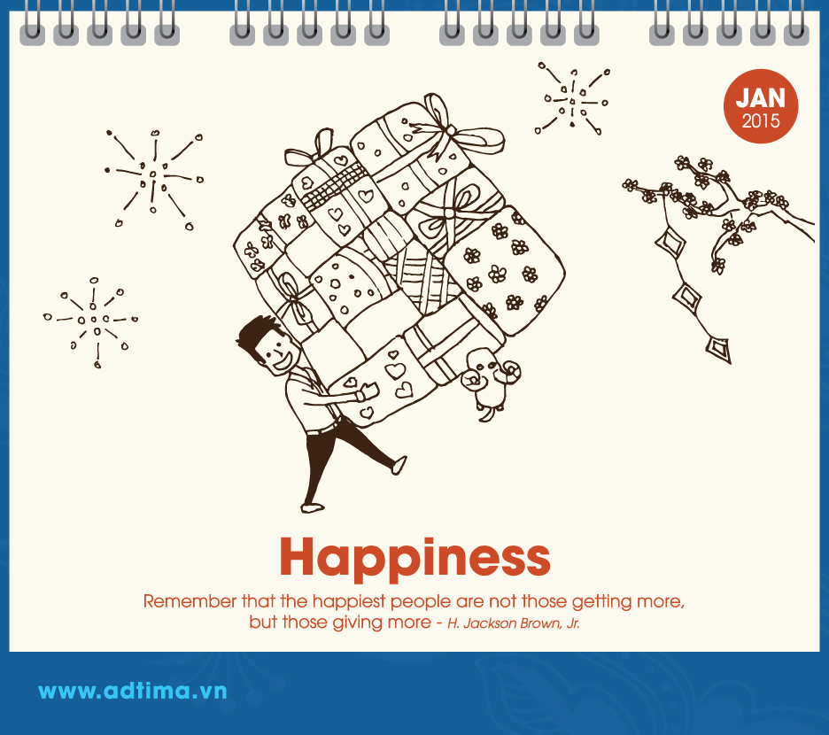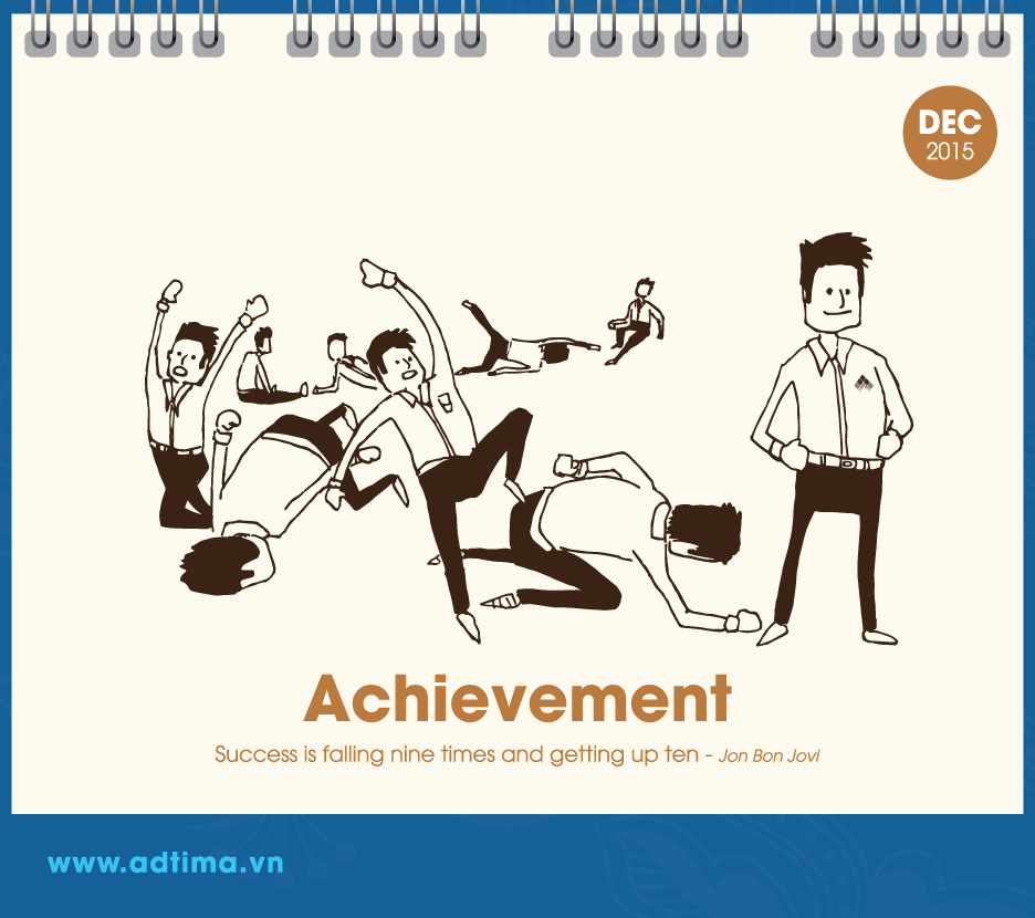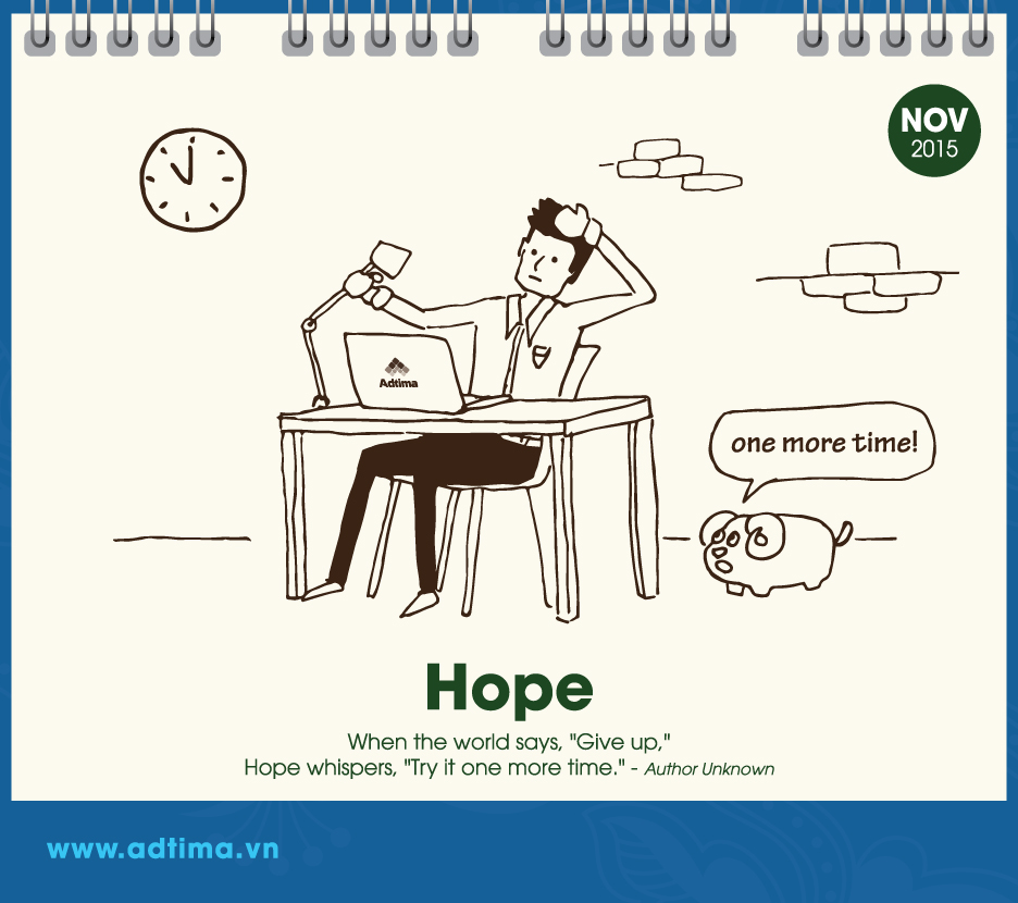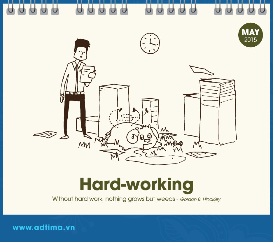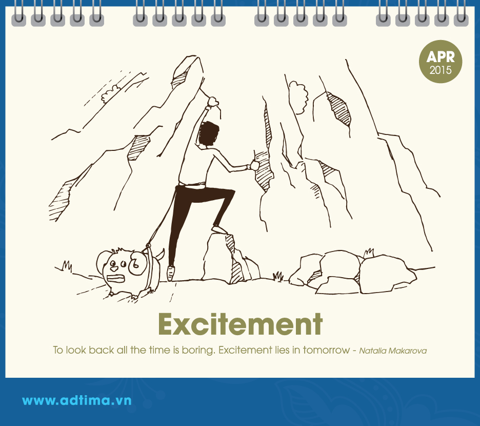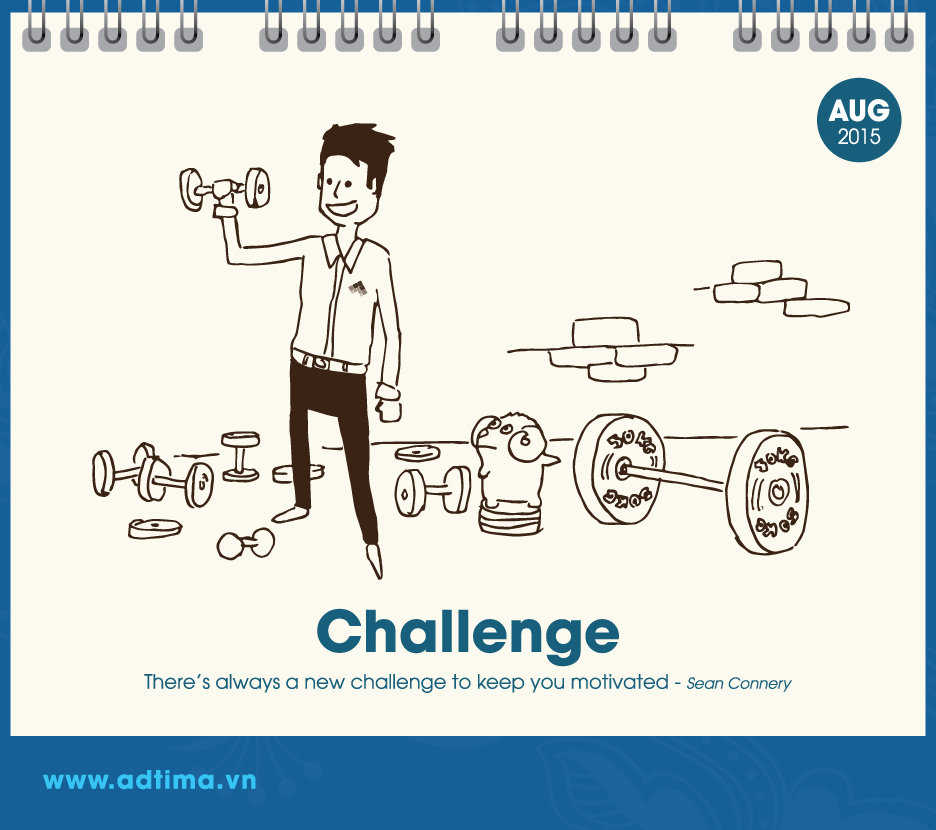Theo đó, từ tháng 1 đến tháng 3 là những hình vẽ xoay quanh chủ đề mùa xuân, mùa mang lại niềm vui, hạnh phúc và sự tươi đẹp (happiness, love, beauty). Từ tháng 4 đến tháng 6 dân văn phòng bước vào guồng công việc nên chủ đề hướng đến sự hứng khởi, làm việc chăm chỉ và khám phá (excitement, hard – working, discovery). Từ tháng 7 đến tháng 9 dân văn phòng cần phải tiếp thêm nhiều năng lượng cho cuộc sống, vượt qua thử thách và kết nối với các bộ phận khác để đi đến thành công (energy, challenge, connection). Ba tháng cuối năm – từ tháng 10 đến tháng 12 – là giai đoạn nước rút để đạt được mục đích nên chủ đề của ba tháng này là sự động viên, hy vọng và thành tựu (motivation, hope, achievement).