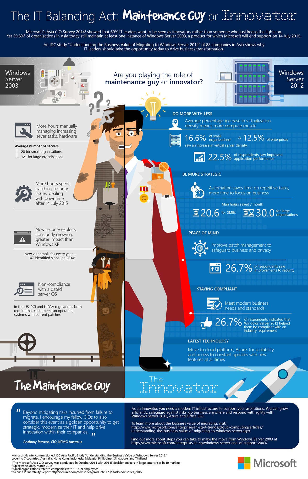 Ông Anthony Stevens, Giám đốc CNTT, KPMG Australia chia sẻ: “Ngoài việc loại trừ toàn bộ rủi ro khi chuyển dịch lên nền tảng mới, đây là cơ hội vàng cho các chuyên gia CNTT có một hệ thống CNTT chiến lược, hiện đại và giúp đưa các cải tiến vào trong tổ chức. Kết thúc một chương cũ, chúng ta có một khởi đầu mới. Đây là cơ hội để định nghĩa lại vai trò CNTT để dẫn dắt doanh nghiệp chuyển đổi vào thời đại của đám mây, di động, dữ liệu lớn và mạng xã hội. Đừng đẩy chúng ta vào vị trí lỗi thời vì sử dụng các công nghệ thiếu hiện đại như Windows Server 2003”.