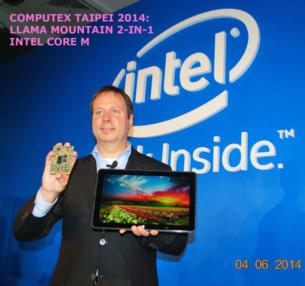 Trong buổi trình diễn của mình tại Taipei, ông Skaugen đã hí hửng khoe làm dân công nghệ phải nuốt dịch vị liên tục cái thiết kế tham khảo (reference design) chạy Core M tên là Llama Mountain. Đó là thiết bị 2-trong-1 (laptop lai tablet) có màn hình 12.5 inch, dày 7,2mm với bàn phím rời và nặng 670 gram. Cũng có một phiên bản Llama Mountain 10 inch mỏng chỉ 6,8mm. Để so sánh, bạn cầm Apple iPhone 6 lên coi đi, bề dày của chiếc smartphone màn hình 4.7 inch này là 6,9mm.
