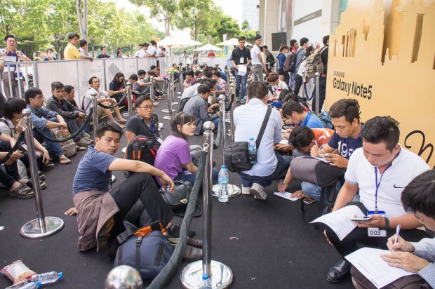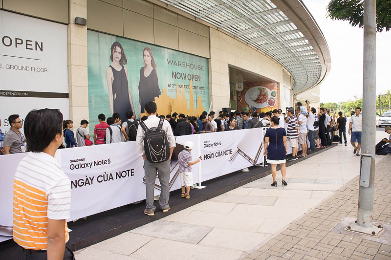 (STS:29.08.2015) Vẫn là những cảnh xếp hàng chờ đợi trong trật tự, nhưng so với đợt mở bán chính thức bộ đôi S6 và S6 edge, số người đăng ký và chờ đợi mở bán Galaxy Note 5 có phần đông hơn đáng kể.