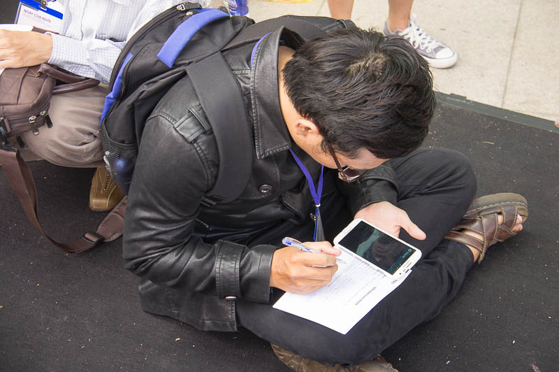 Ở bên ngoài, nhân viên của Samsung trình bày về những tính năng mới của dòng Galaxy Note 5