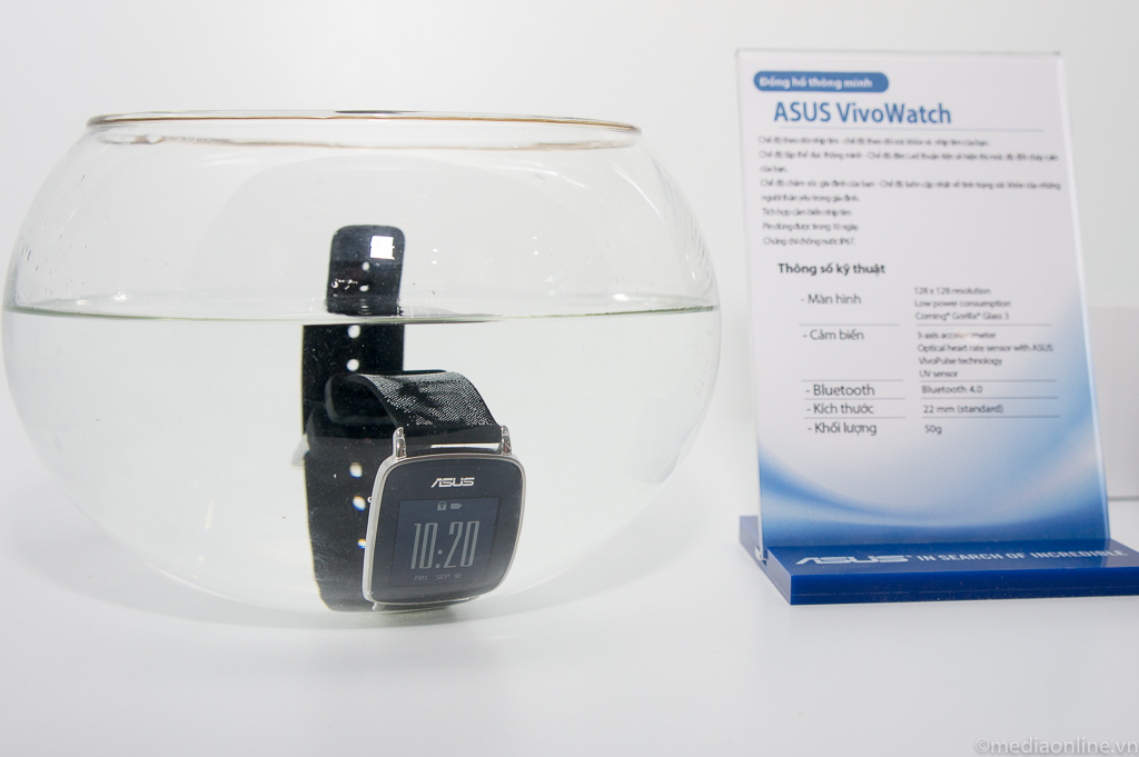 ï Asus VivoWatch: thiết bị đeo tay quản lý sức khỏe vừa trình làng của Asus với pin lên đến 10 ngày, tập trung vào các tính năng quản lý quá trình luyện tập, cho phép lên các kế hoạch tập luyện và theo dõi quá trình người dùng thực hiện mục tiêu của mình. Với chứng nhận IP67, VivoWatch có thể hoạt động trong 30 phút dưới độ sâu gần 1 mét.