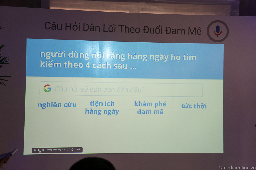 Trao đổi tại sự kiện, bà Nguyễn Phương Anh – Giám đốc tiếp thị Google tại thị trường Việt Nam đã nêu những con số thống kê ấn tượng trong năm vừa qua, như lượng truy cập qua điện thoại thông minh đã tăng từ 36% trong năm 2014 lên đến mức 55%. Bà cho biết “Những thế hệ tìm kiếm ngày nay tại Việt Nam luôn mong muốn thử những điều mới, luôn hiếu kỳ, đồng thời những câu hỏi cũng mở ra cho họ một thế giới với nhiều cơ hội mới. Một điểm đặc biệt là đa phần trong số họ đều sử dụng điện thoại thông minh, điều này giúp họ có thể khám phá bất cứ lúc nào, ở bất cứ đâu”