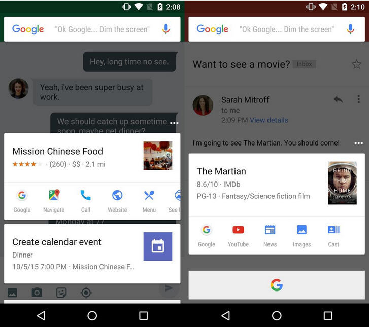 Android 6 có thêm nút Google Now on Tab. Như vậy là trợ lý cá nhân số Google Now giờ đây đã trở thành một bộ phận của smartphone và tablet. Trong khi đang hí hoáy gõ nhắn tin hay tìm kiếm cái gì đó, bạn có thể chạm tay lên nút này để có thêm những thông tin bổ sung. Chẳng hạn, bạn đang nhắn tin cho bạn bè về một nhà hàng mới ở thành phố, bạn chỉ việc chạm tay lên nút Google Now on Tab là có được những shortcut liên quan tới nhà hàng đó, tìm đường đi tới đó trên Google Maps hay tham khảo các xếp hạng, đánh giá về nhà hàng đó trên Yelp.