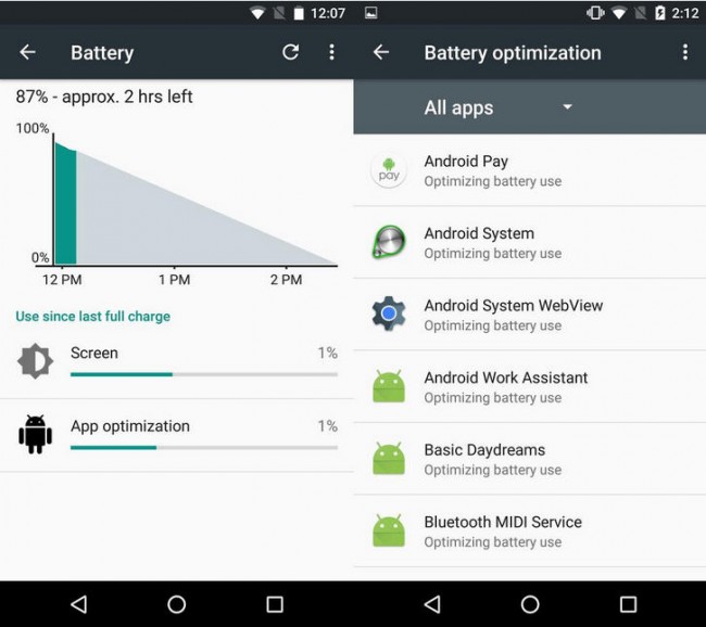 Những tính năng tiết kiệm pin mới được tích hợp vào Android 6 được hứa hẹn sẽ giúp kéo dài thời lượng dùng pin hơn trước đây. Khi dùng chế độ Doze mode, hệ thống sẽ tắt các ứng dụng không cần thiết vẫn đang chạy ở nền, mà chỉ duy trì những tác vụ cơ bản như gọi điện, nhận tin, báo thức,…