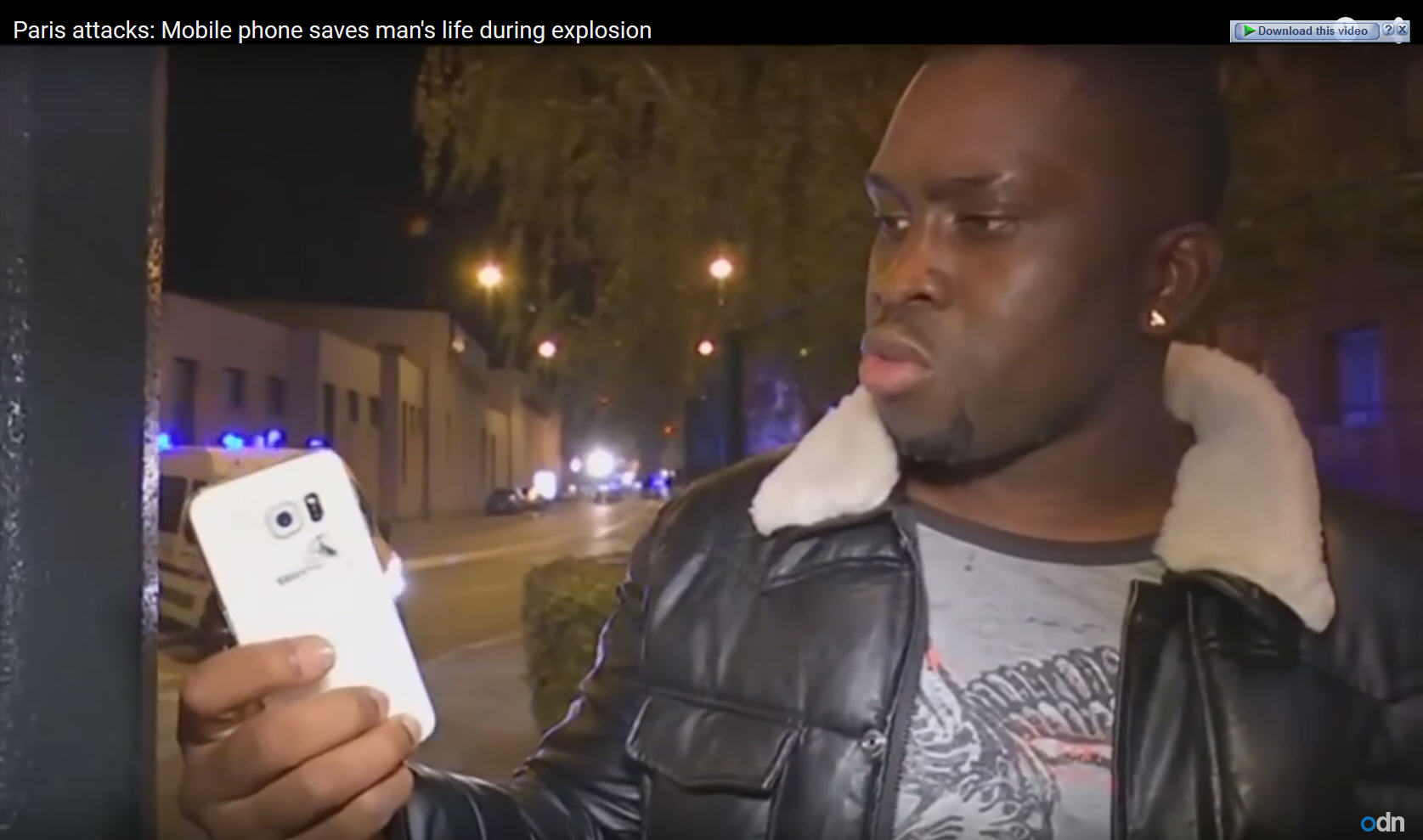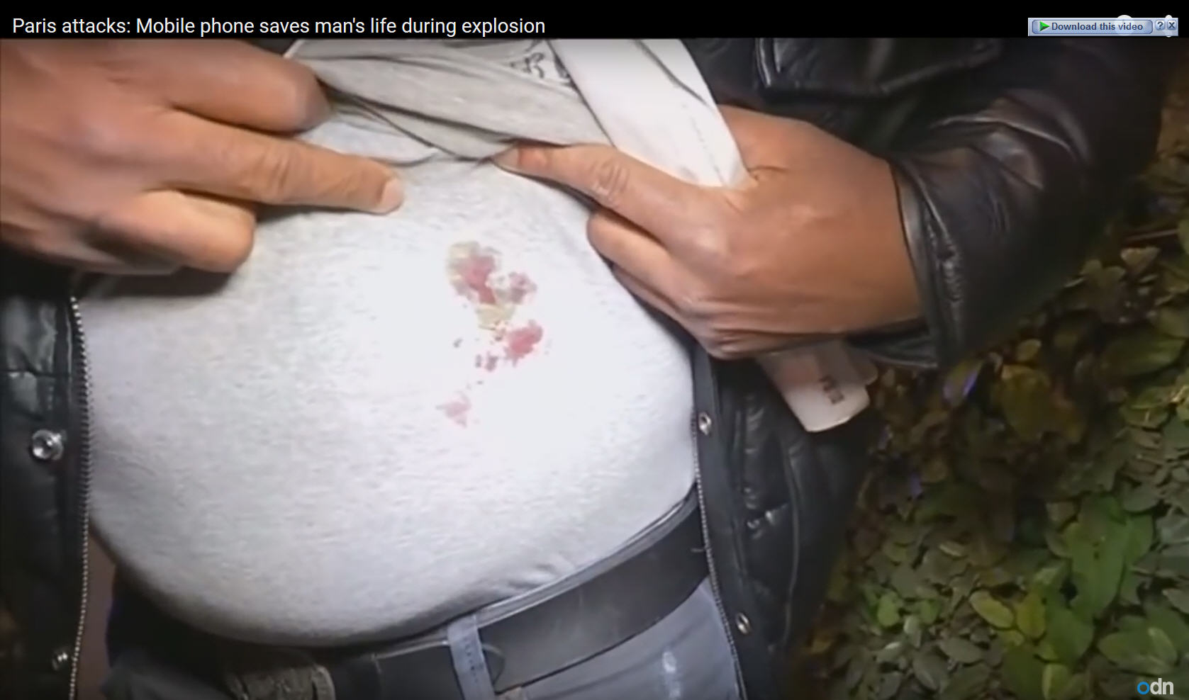 (STS:16.11.2015) Theo dịch vụ tin tức theo yêu cầu ODN, trong vụ khủng bố đánh bom tại sân vận động Stade de France (Paris, Pháp) tối thứ Sáu 13-11-2015, một người đàn ông da đen đã được cứu sống nhờ có chiếc smartphone che mảnh bom cho mình. Nhờ vậy mà anh chỉ bị xây xát nhẹ nơi phần ngực trái.
