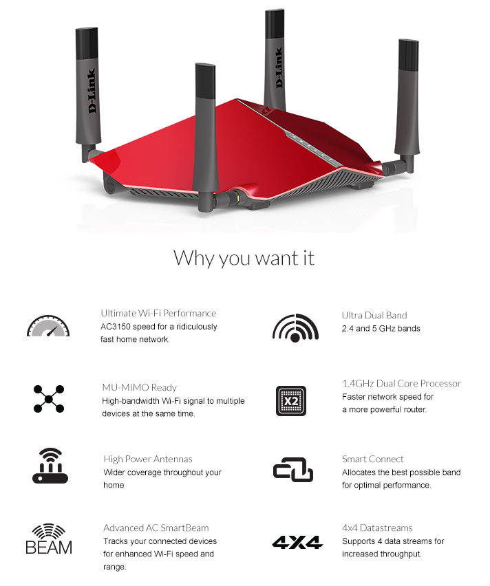 Tính năng SmartBeam tích hợp trong DIR-885L phủ sóng rộng hơn với tín hiệu tốt hơn. Nhờ tính năng MU-MIMO đi kèm với công nghệ AC thế hệ thứ 2, DIR-885L cho phép nhiều người sử dụng truyền/nhận dữ liệu đồng thời với tốc độ truy cập nhanh hơn – tương tự như việc mở rộng thêm nhiều làn xe trên đường cao tốc Wi-Fi để giao thông thông thoáng hơn. Với bộ vi xử lý dual-core 1.4GHz và công nghệ Broadcom NitroQAM mới nhất, DIR-885L nâng cấp tốc độ truyền dữ liệu không dây lên đến 2167Mpbs trên băng tần 5GHz và lên đến 1000Mbps trên băng tần 2.4GHz. Đó là lý do mà D-Link gọi thiết bị mạng này là chuẩn AC3150 (Mbps).