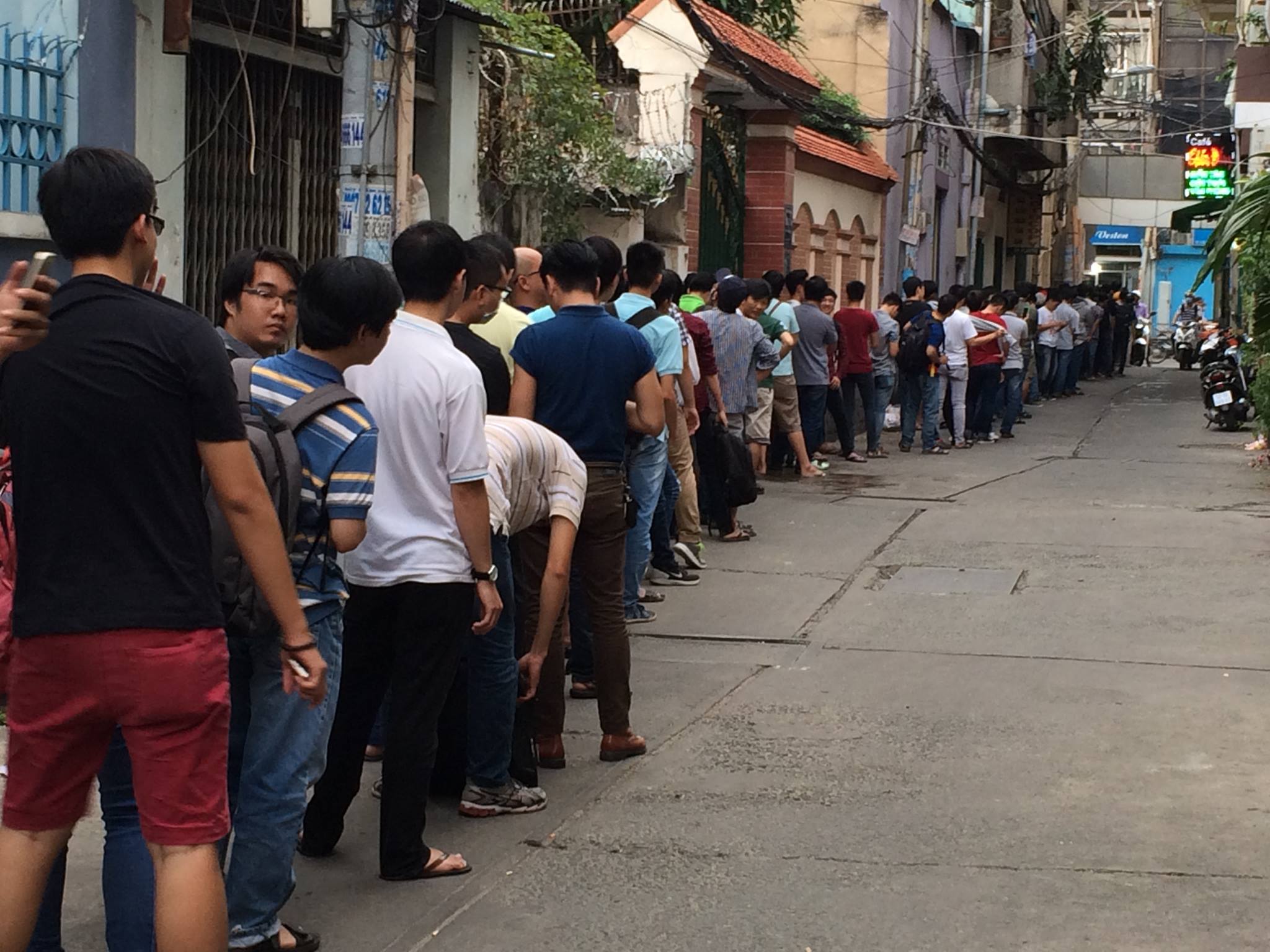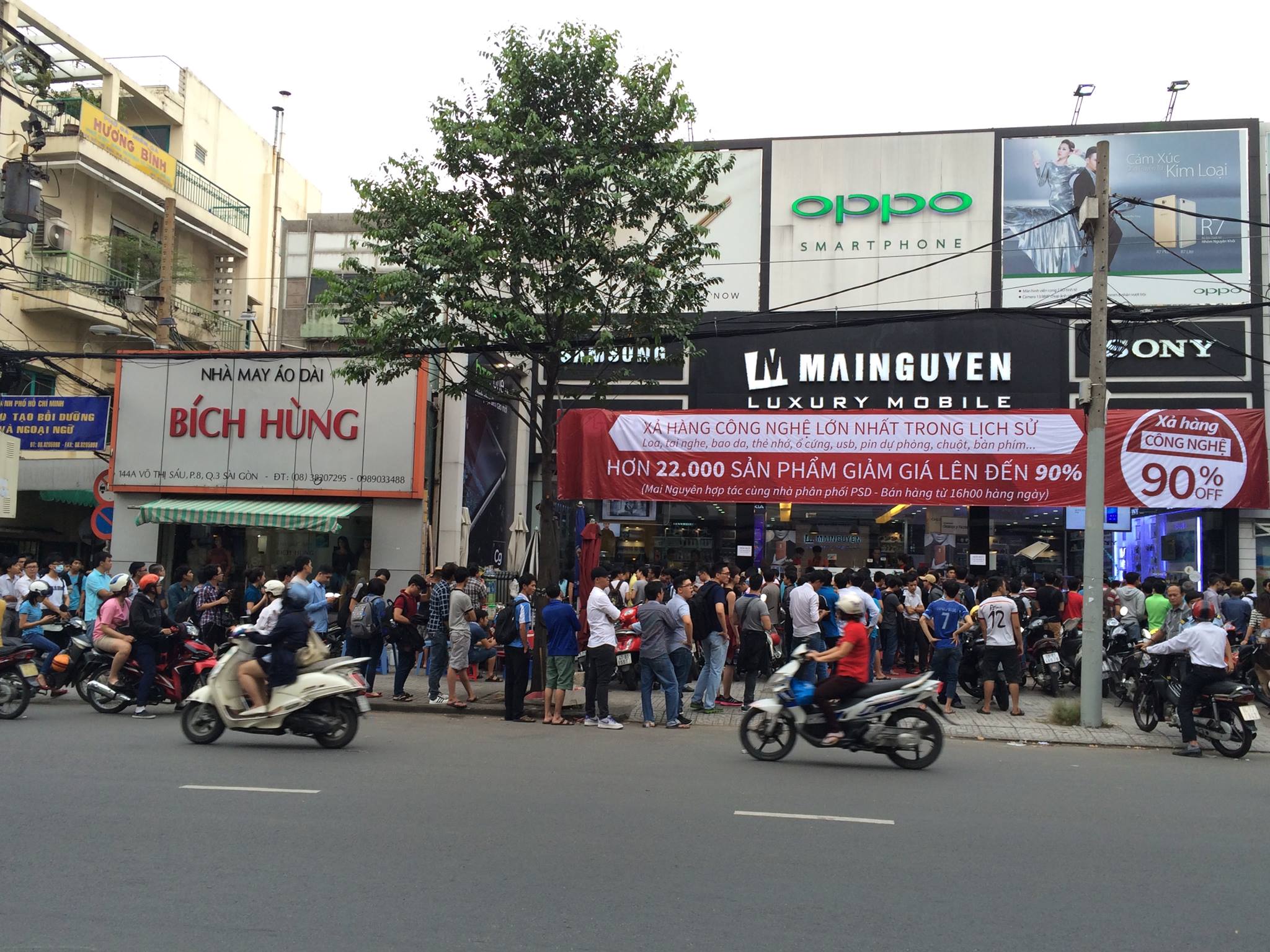 Ngay từ lâu trước thời điểm bắt đầu bán hàng vào lúc 4 giờ chiều ngày thứ Sáu 27-11-2015 tại cửa hàng Mai Nguyên Luxury (144 Võ Thị Sáu, Q.3, TP.HCM), rất đông nam phụ lão ấu, giới nào cũng có, phái nào cũng đủ mặt, đã xếp hàng rồng rắn từ trong hẻm kế bên ra tới lề đường trước cửa hàng.