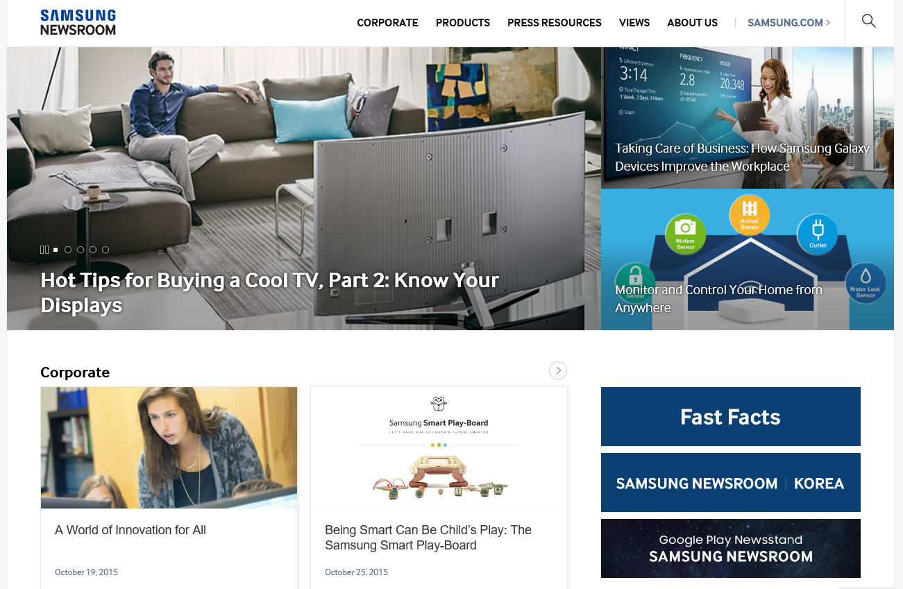 (STS:30.11.2015) Công ty Điện tử Samsung hồi hạ tuần tháng 11-2015 đã chính thức ra mắt website Samsung Newsroom, một ngôi nhà mới tổng hợp tin tức và nội dung kỹ thuật số từ Samsung với địa chỉ mới là http://news.samsung.com/. Samsung Newsroom bao gồm cả tiếng Anh và tiếng Hàn, chính thức thay thế Samsung Tomorrow blog của Tập đoàn Điện tử Samsung.