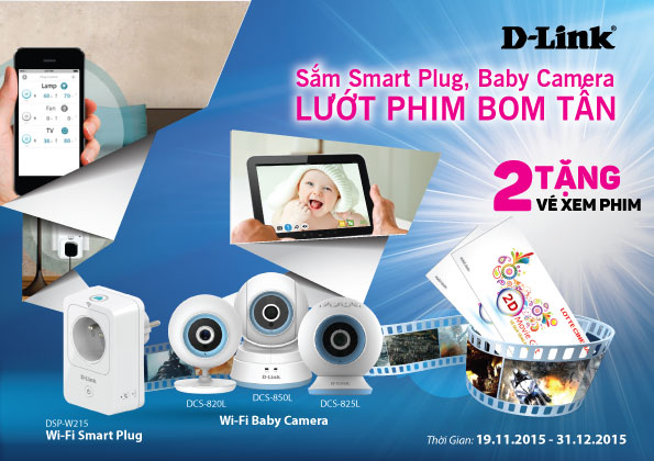 Khách hàng mua các sản phẩm D-Link Wi-Fi Smart Plug (DSP-W215) và các Wi-Fi Baby Camera (DCS-850L, DCS-825, DCS-820L) trên toàn quốc sẽ được tặng 2 vé XEM PHIM cho một sản phẩm.