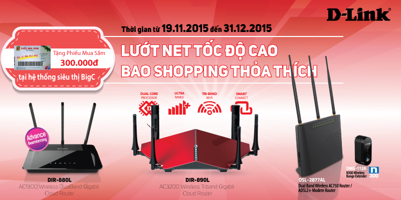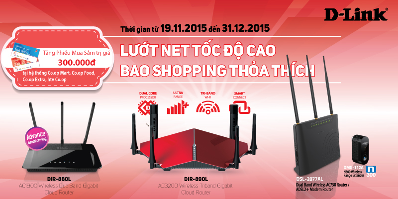 Khách hàng mua các Wireless Router D-Link DIR-880L (AC1900 Wireless DualBand Gigabit Cloud Router), DIR-890L (AC3200 Wireless TriBand Gigabit Cloud Router) và DSL-2877AL (DualBand Wireless AC750 Router/ADSL2+ Modem Router) + DMG-112A (Wireless N300 USB Range Extender) sẽ nhận được 1 Phiếu mua sắm 300.000 đồng cho 1 sản phẩm để mua hàng tại: