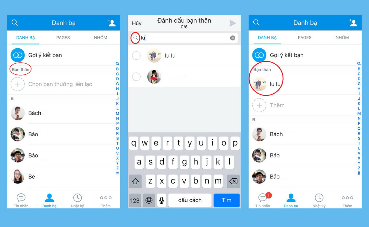 Để tạo trang “Nhật ký chung”, người dùng vào phần Danh bạ chọn mục Bạn thân và tùy ý thêm bạn bè, người yêu, người thân vào danh sách.