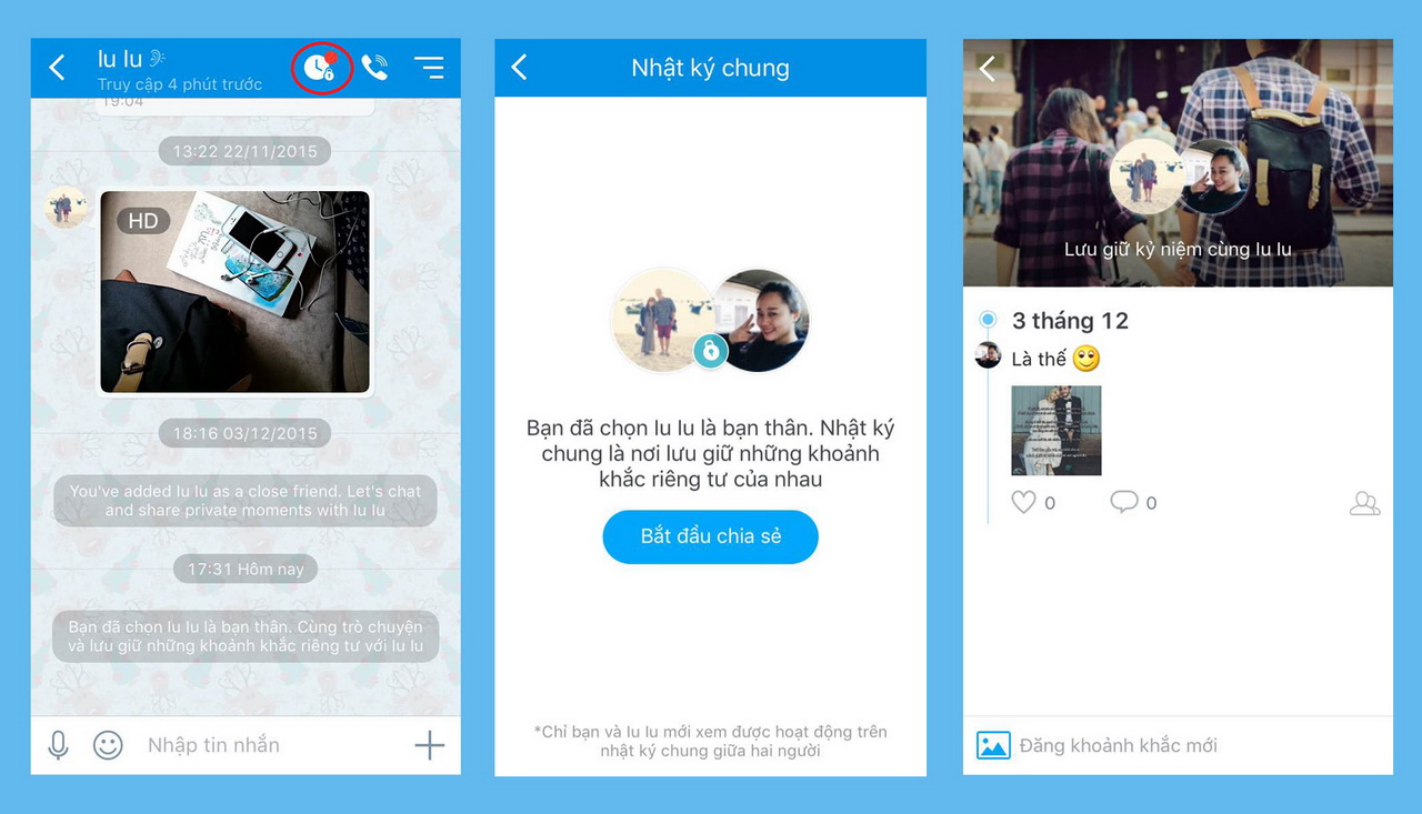 (STS:10.12.2015) Dịch vụ nhắn tin Việt Zalo vừa thêm tính năng “Nhật ký chung” cho phép hai người bạn thân cùng chia sẻ và lưu trữ những khoảnh khắc riêng tư với nhau.