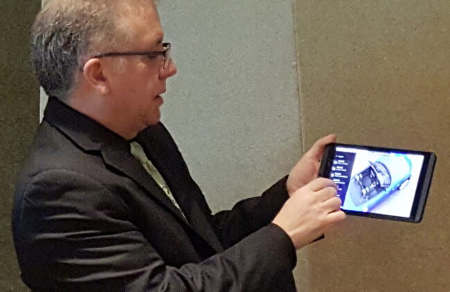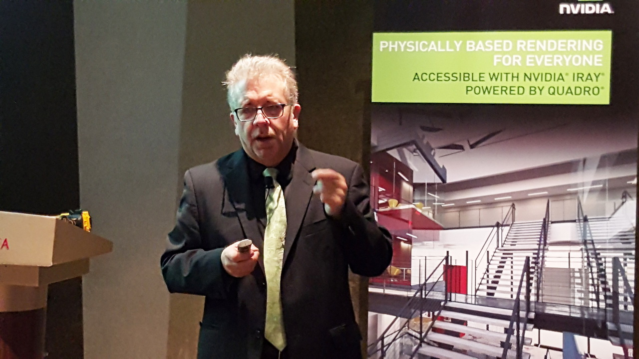 Ông Bob Pette đang trỉnh diễn NVIDIA Iray trên tablet kết nối không dây với một workstation chạy 2 card đồ họa Quadro M6000.