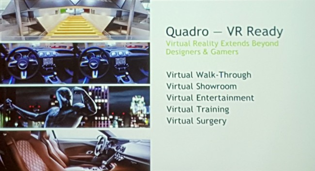 NVIDIA đã phát triển công nghệ VR dựa trên sức mạnh của các GPU của mình, đặc biệt là Quadro. VR giúp mở rộng sức sáng tạo và tầm nhìn của các nhà thiết kế và các game thủ. Nó được ứng dụng trong mọi lĩnh vực của cuộc sống, như kiểm tra, trình diễn, giải trí, huấn luyện… thậm chí giải phẫu.