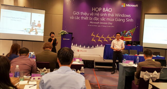 (STS:17.12.2015) Ngày Thiết bị Microsoft – Microsoft Device Day đã được Microsoft Việt Nam cùng các đối tác phân phối thiết bị trong và ngoài nước phối hợp tổ chức tại TP.HCM sáng 17-12-2015. Đây là sự kiện nhằm chia sẻ về giải pháp và thiết bị công nghệ tối ưu, đáp ứng nhu cầu đa dạng của người dùng trong nước và giới thiệu những thiết bị phù hợp với yêu cầu riêng của từng môi trường như doanh nghiệp, gia đình hay phục vụ công tác học tập và nghiên cứu, đón đầu mùa mua sắm cuối năm.