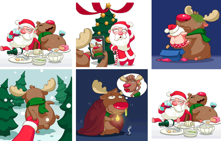 Bộ sticker dựa trên những hình tượng Giáng sinh quen thuộc như ông già Noel, tuần lộc, hoa tuyết, cây thông…cùng 2 màu chủ đạo xanh lục và đỏ nhưng được thể hiện bằng nét vẽ ngộ nghĩnh và ý tưởng hài hước. Chẳng hạn như ông già Noel thường cưỡi tuần lộc để đi trao quà thì trong bộ sticker này, ông lại “phóng” xe máy vù vù dưới trời tuyết rơi, chú tuần lộc thì “quá chén” nằm ngủ khò khò, tuần lộc và ông già Noel chụp hình “tự sướng” bên cây thông…