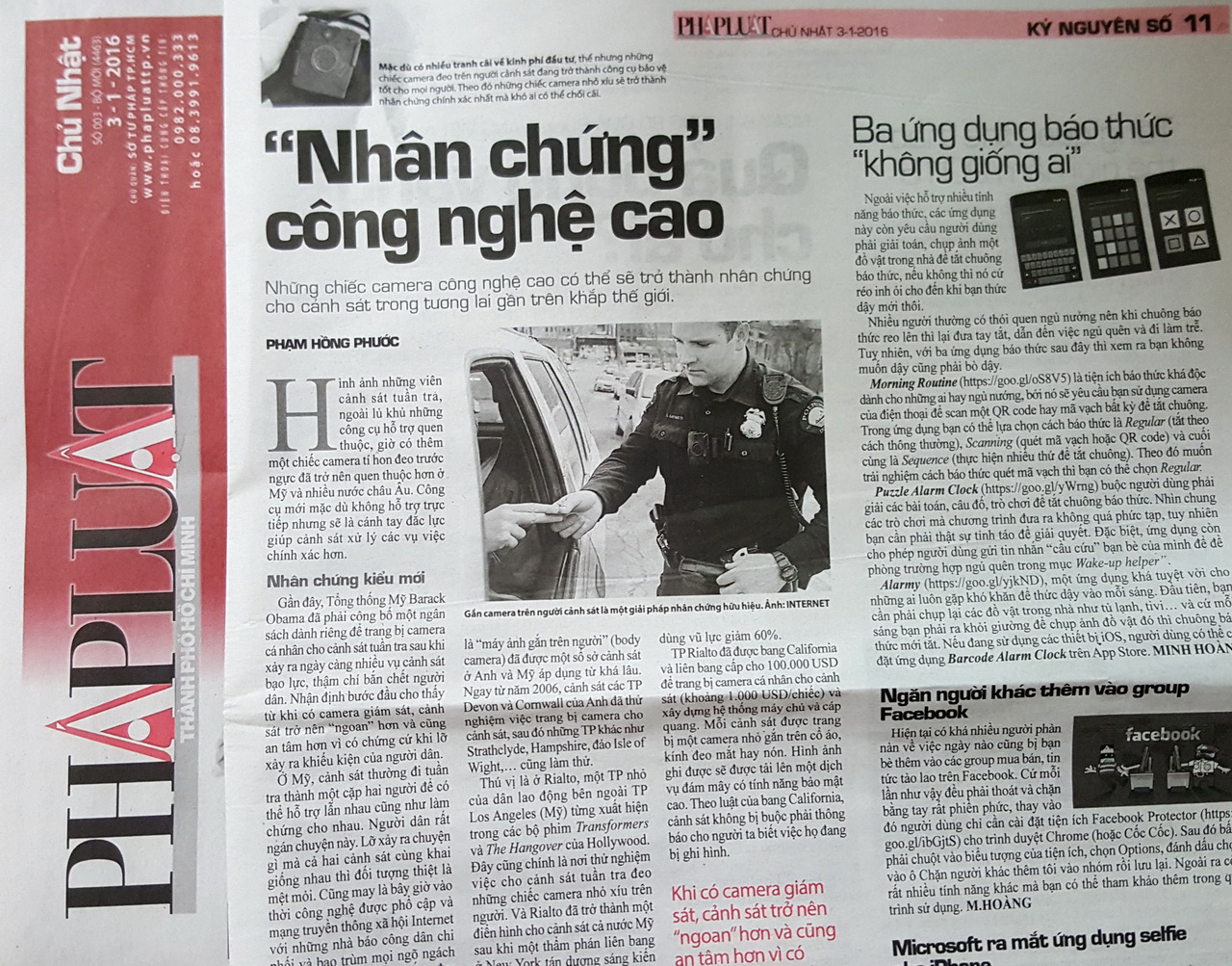 Hình ảnh những viên cảnh sát tuần tra, ngoài lủ khủ những công cụ hỗ trợ quen thuộc, giờ có thêm một chiếc camera tí hon đeo trước ngực đã trở nên quen thuộc hơn ở Mỹ và nhiều nước châu Âu. Công cụ mới mặc dù không hỗ trợ trực tiếp nhưng sẽ là cánh tay đắc lực giúp cảnh sát xử lý các vụ việc chính xác hơn.