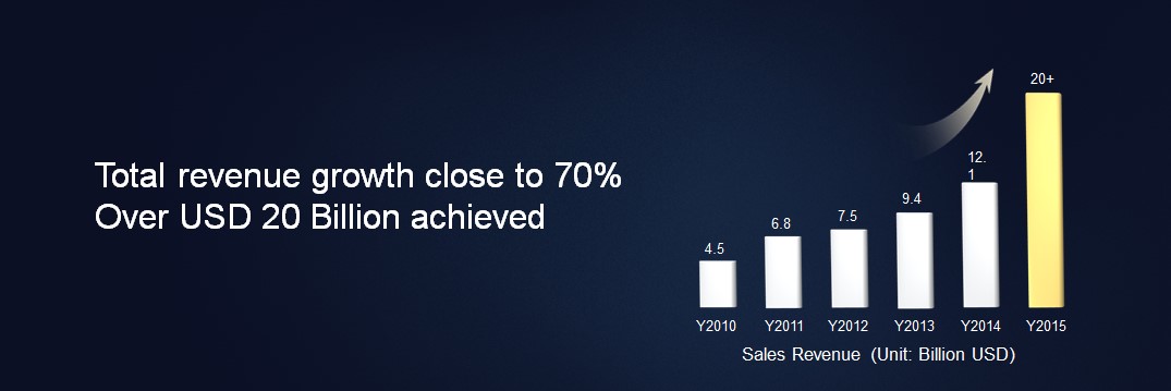 (STS:07.01.2016) Tại Triển lãm Điện tử tiêu dùng quốc tế CES 2016 ở Las vegas (Mỹ) từ ngày 6 tới 9-1-2016, ngành kinh doanh tiêu dùng Huawei đã công bố kết quả kinh doanh năm 2015 mà họ đánh giá là thành công vượt trội. Doanh số của Huawei trên thế giới đã đạt được 20 tỷ USD trong năm 2015, tăng gần 70% so với năm 2014. Bên cạnh đó, Huawei đã bán ra 108 triệu smartphone trong năm 2015, tăng 44% so với năm 2014, và trở thành nhà sản xuất smartphone hàng đầu Trung Quốc.