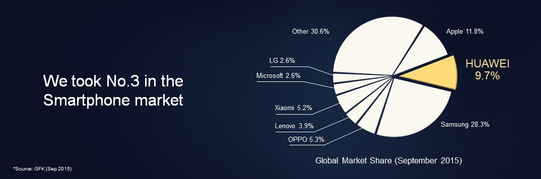Bằng việc bán ra 108 triệu smartphone trong năm 2015, Huawei đã khẳng định vị thế là một trong ba công ty đứng đầu về thị phần điện thoại di động (sau Samsung và Apple), đồng thời giảm thiểu đáng kể khoảng cách với các công ty đối thủ. Bên cạnh đó, Huawei đạt được thị phần cao nhất ở thị trường Trung Quốc từ tháng 3-2015. Trong khoảng thời gian này, Huawei đã cho ra mắt hai sản phẩm điện thoại thông minh cao cấp là Huawei P8 và Mate S. Ở thị trường Tây Âu, Huawei cũng đạt được kết quả ấn tượng về mặt thị phần trong phân khúc điện thoại thông minh cao cấp (hi-end smartphone, có mức giá bán từ 400 – 500 EUR). Đồng thời, Huawei cũng nằm trong top 3 về thị phần tại Tây Ban Nha, Ý, Bỉ, Thụy Sĩ, Bồ Đào Nha và một số quốc gia khác.