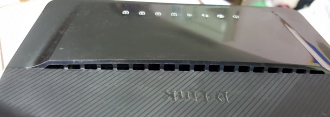 Gắn cáp cấp nguồn cho router và nhấn nút Power phía sau lưng. Đèn LED nguồn phía trước sẽ sáng xanh. Các đèn LED nằm xếp hàng phía gần mép mặt trên của router này nhỏ xíu xiu nên khó thấy.