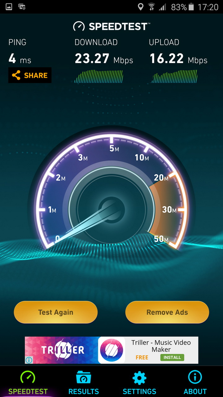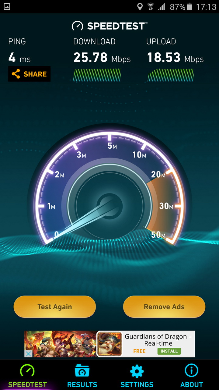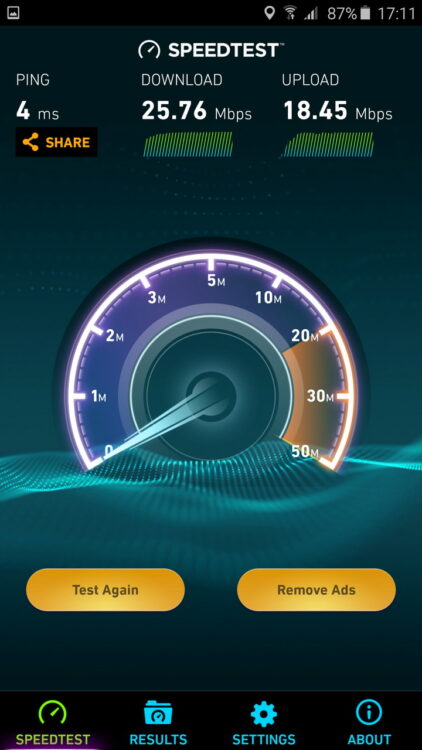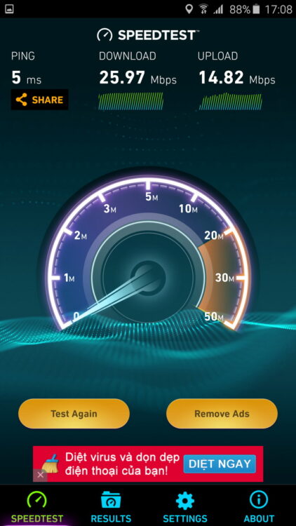DigiTestLAB của chúng tôi đã dùng ứng dụng OOKLA SpeedTest trên smartphone Samsung Galaxy Note 5 chạy Android 5.1.1 để đo tốc độ truyền tải của DIR-859 theo 2 kịch bản.