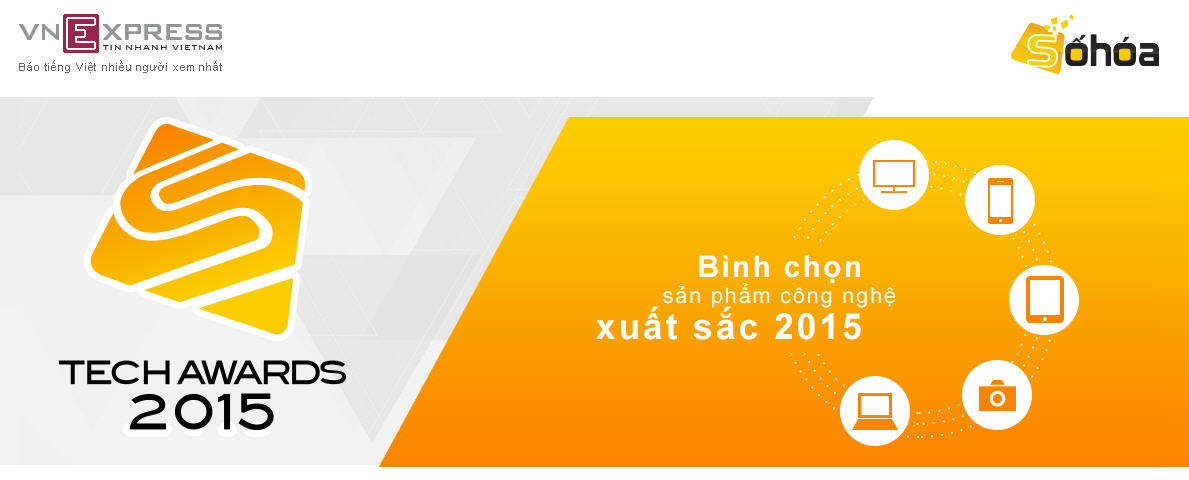 (STS:12.01.2016) Tối nay tại Gem Center (Q1, TP.HCM), các sản phẩm đoạt giải trong chương trình bình chọn Sản phẩm Công nghệ Xuất sắc Tech Awards 2015 sẽ được vinh danh tại lễ trao giải. Đây là một giải thưởng bình chọn sản phẩm công nghệ hàng năm do trang công nghệ Số Hóa báo điện tử VnExpress tổ chức từ năm 2012. Mục đích của chương trình là tìm ra những sản phẩm công nghệ đáng chú ý của năm theo 5 hạng mục: Điện thoại, Máy tính bảng, Máy tính xách tay, Máy ảnh và Tivi.