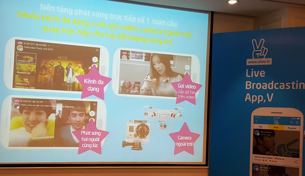 Vào tháng 11-2015, V Live đã phát triển kênh đại diện tại Việt Nam có tên gọi <Xin Chào V> để các ngôi sao của Việt Nam có thể tiếp xúc với người sử dụng của Hàn Quốc cũng như người sử dụng trên toàn thế giới thông qua ứng dụng V. Hiện nay, các ngôi sao được yêu thích của Việt Nam như Chi Pu, Đông Nhi, Phở Đặc Biệt, Gil Lê v.v… đang làm các kênh riêng để thực hiện các chương trình phát sóng cá nhân. Tới ngày 19-1-2016 có khoảng 20 ngôi sao Việt Nam đã tham gia vào V như Đông Nhi, Chi Pu, Ngô Kiến Huy, Phở, Kelvin, Gil Lê, Thanh Duy, Ha Ri Won, St.319, Bảo Thy, Trịnh Thăng Bình, Soo Bin Hoàng Sơn, The Men, Khổng Tú Quỳnh, Ngọc Thảo, Bùi Anh Tuấn, Chibi, Song Yến (Yến Trang – Yến Nhi), Suboi, Huyền Anh. Các ngôi sao này sẽ chia sẻ hình ảnh sinh hoạt đời thường, các chương trình làm đẹp, gặp mặt trực tiếp người hâm mộ theo thời gian thực và nhận những phản ứng nóng hổi từ những người hâm mộ.